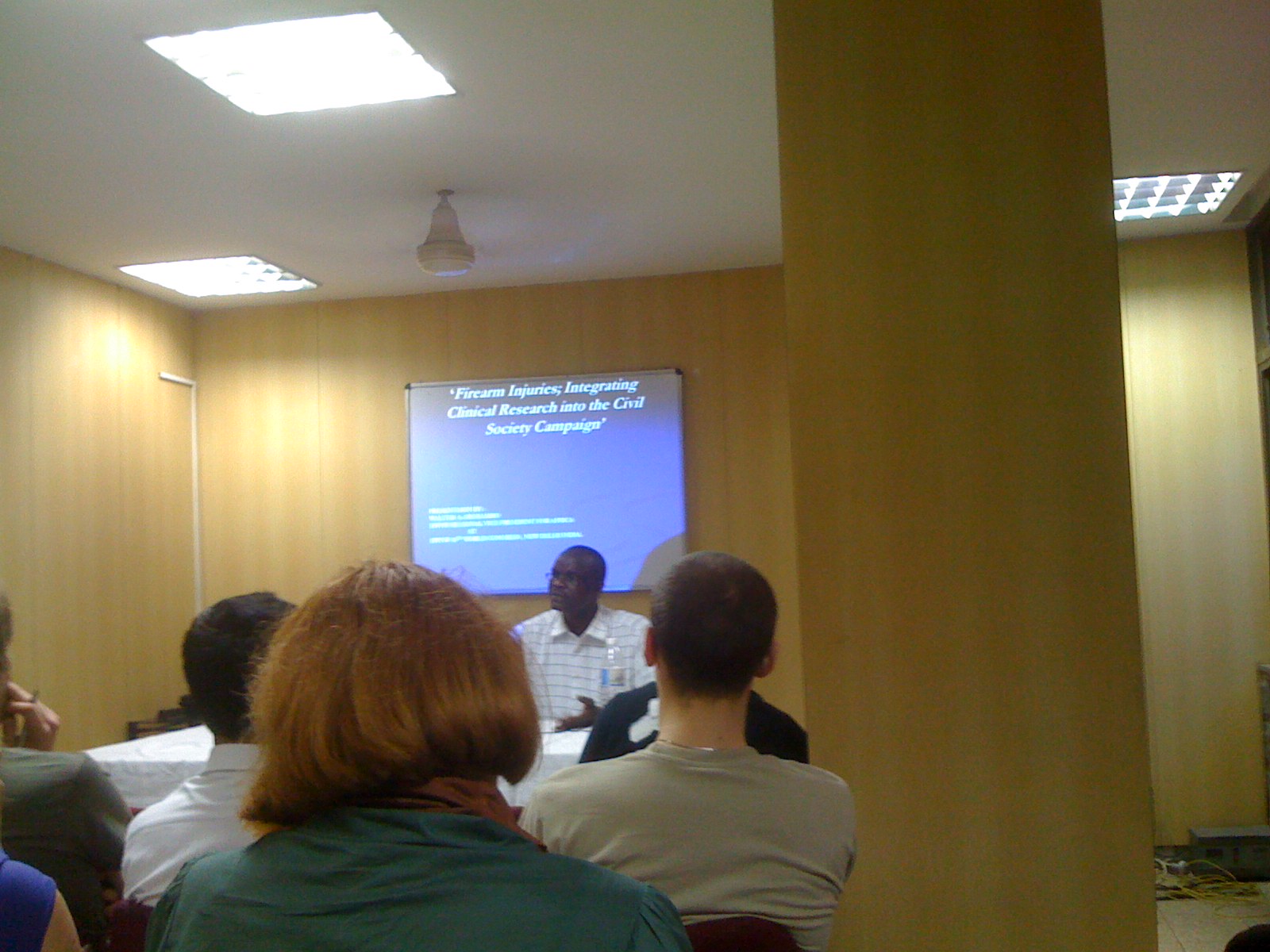 Walter Odhiamso presenting on clinical research on small arms in Kenya