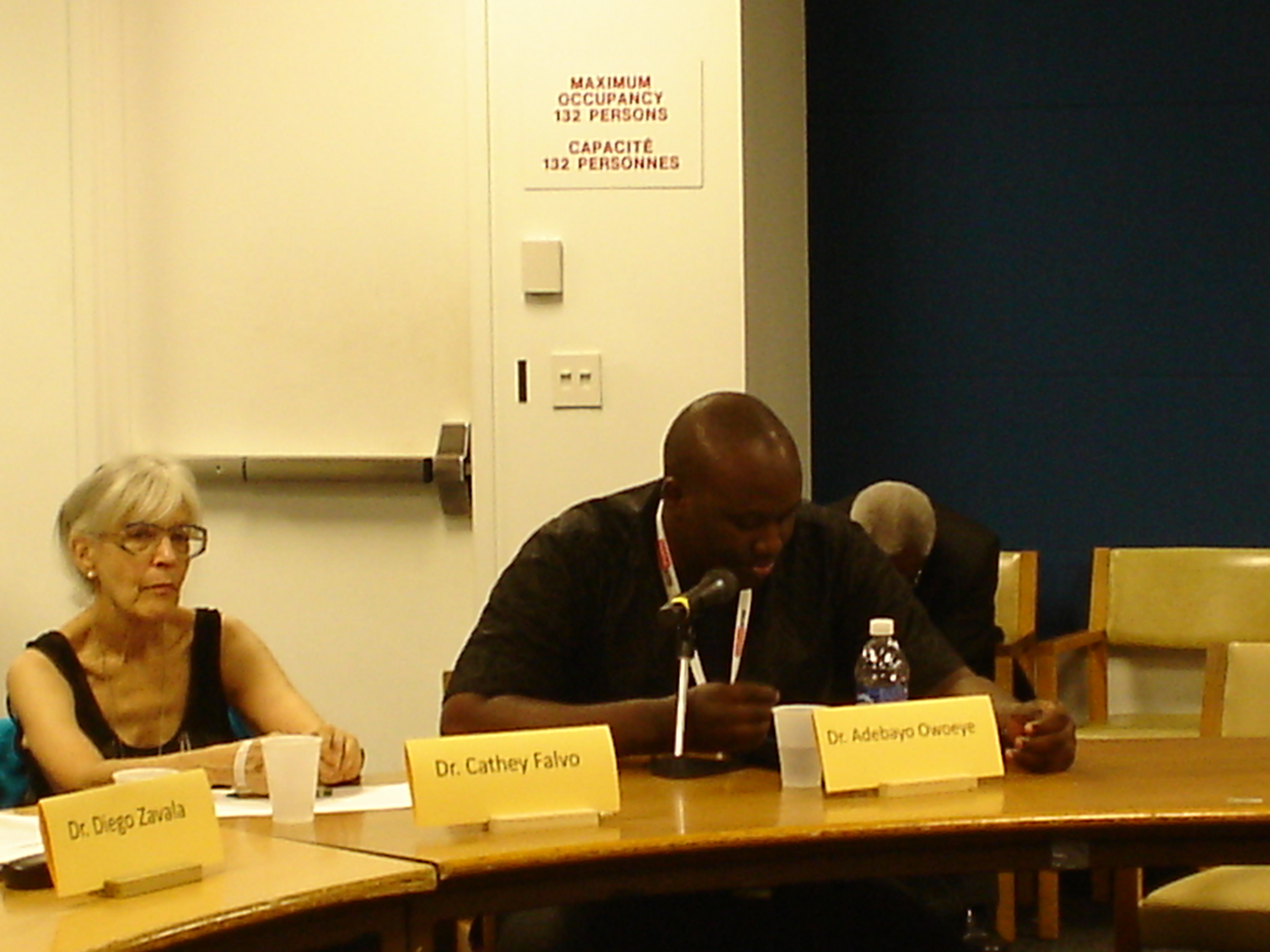 Dr. Omolade Oladejo, IPPNW Nigeria, addresses delegates to the UN ATT 4th Prepcom, while Chairman Moritan (L) looks on.
