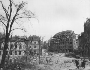 View of destroyed buildings on a city street in Germany at the end of World War II; United States Holocaust Memorial Museum