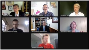 Panelists at the webinar marking the TPNW’s entry into force included (from top left) Tilman Ruff, IPPNW; Carlos Umaña, IPPNW; Erica Burton, ICN; Mahmood Al-Hamody, IFMSA; David Barbe, WMA; Bettina Borisch, WFPHA; and Veronique Christory, ICRC.