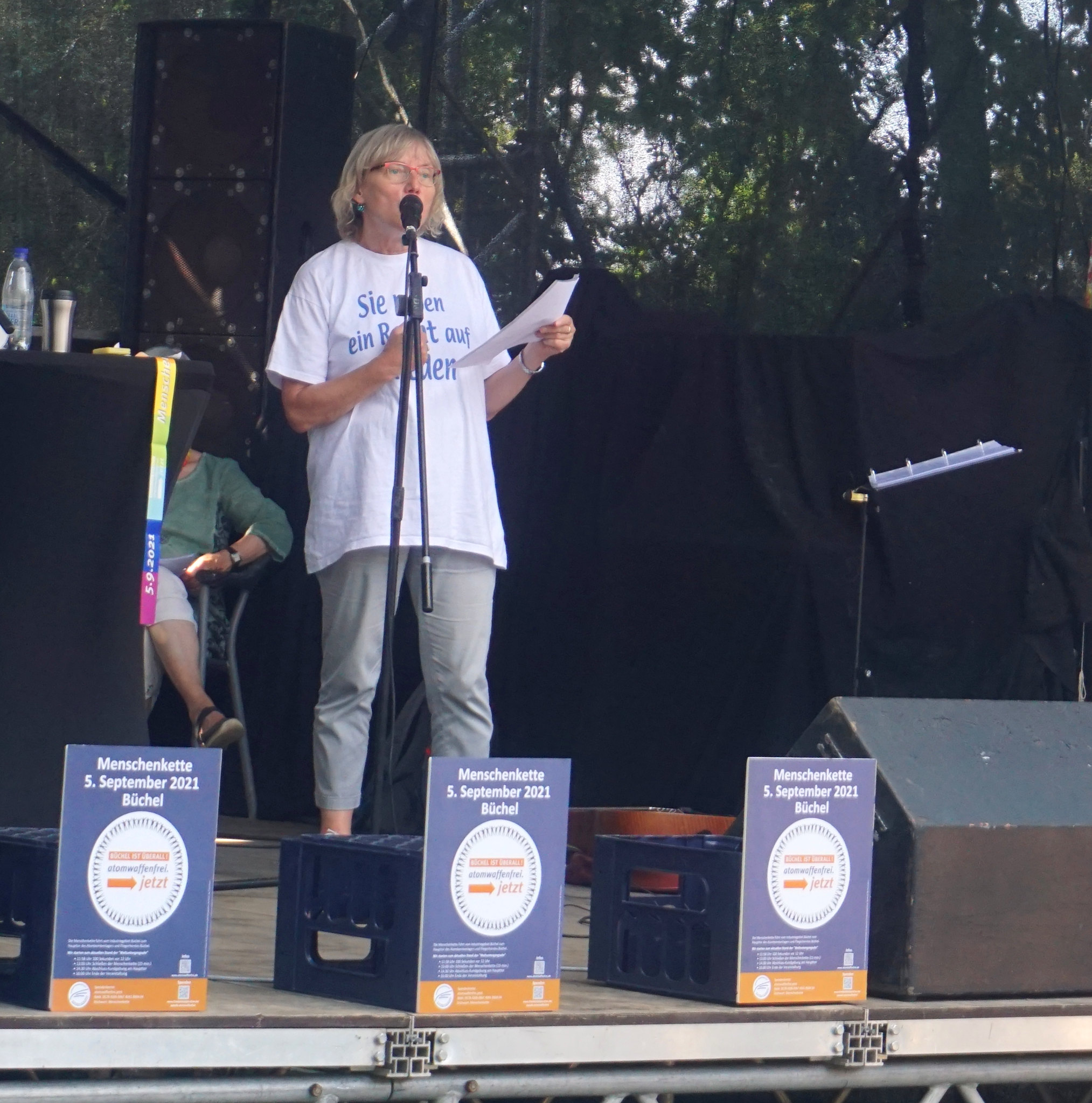 [On September 5, IPPNW regional Vice President Angelika Claussen spoke at a demonstration at the Büchel nuclear base in Germany, where 800 activists formed a human chain to call for the removal of the 20 US nuclear bombs that are stored there.]