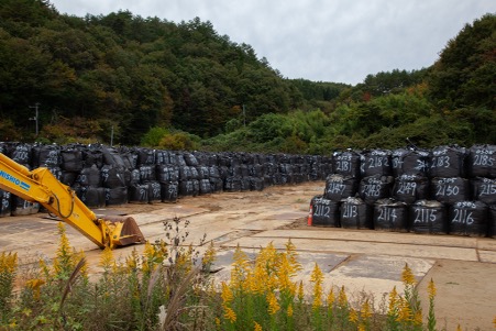 Extensive decontamination by scraping away the upper 5 cm of surface soil for 20m around houses, in fields and gardens, in schools, childcare centres, parks and public gathering places, resulting in the accumulation of 14 million m³ of contaminated soil, has denuded areas and reduced fertility of agricultural land, but has had some useful effect in reducing radiation exposure to residents and contamination of vegetables grown in decontaminated areas. Use of potassium-rich fertiliser has also contributed to reducing caesium absorption by crops. However, forested areas, which comprise 70% of Fukushima, particularly covering hills and mountains which received higher fallout than valleys and low-lying areas, act as reservoirs of radioactivity, which is constantly washed down by rain and snow to flatter and lower-lying areas where people’s homes, farms, paddies and fields lie, and also washes into estuaries and beach sands. This contributes to patchiness and high variability of contamination at a local level, and hence the importance of localised and ongoing measurement.