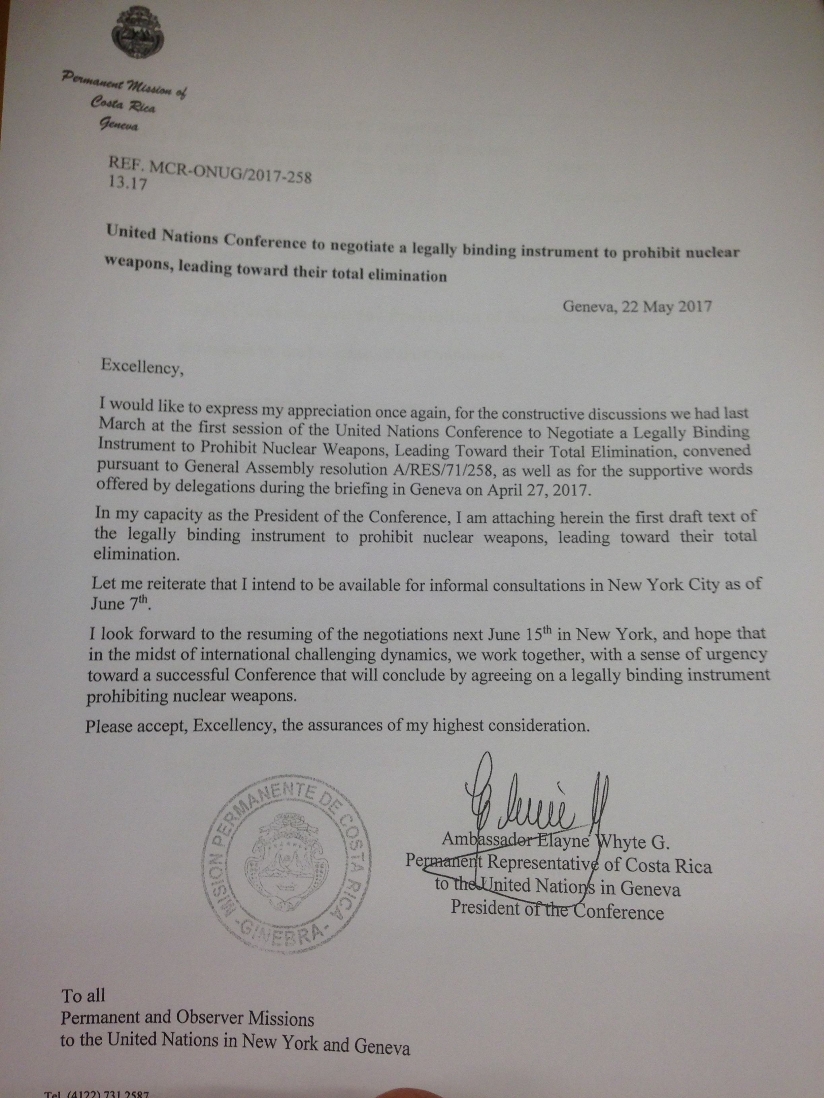 The Draft Convention on the Prohibition of Nuclear Weapons was released today in Geneva by the president of the negotiating conference, Elayne Whyte Gomez of Costa Rica. The draft is based upon proposals made and discussed by participating states and civil society during the first negotiating session in March, and will be the starting point when negotiations resume in June.