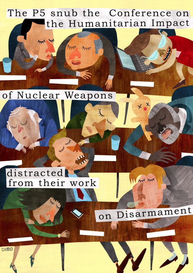 Officially the P5 are saying that the conference will be a diversion from their step by step efforts to reduce the danger of nuclear war. But participants here do not understand how a conference that highlights the dangers these weapons pose could possibly undermine efforts to eliminate them. Rather it is believed that the P5 are concerned that non-nuclear weapons states are becoming increasingly impatient with the slow pace of disarmament negotiations, and will organize to pressure the P5 to meet their obligations, under Article VI of the Non-Proliferation Treaty, to negotiate the complete elimination of these weapons.