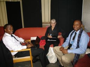 Hakeem Ayinde, Cathey Falvo, and Emeka Okolo (left to right) confer during the UNPOA PrepCom in New York.
