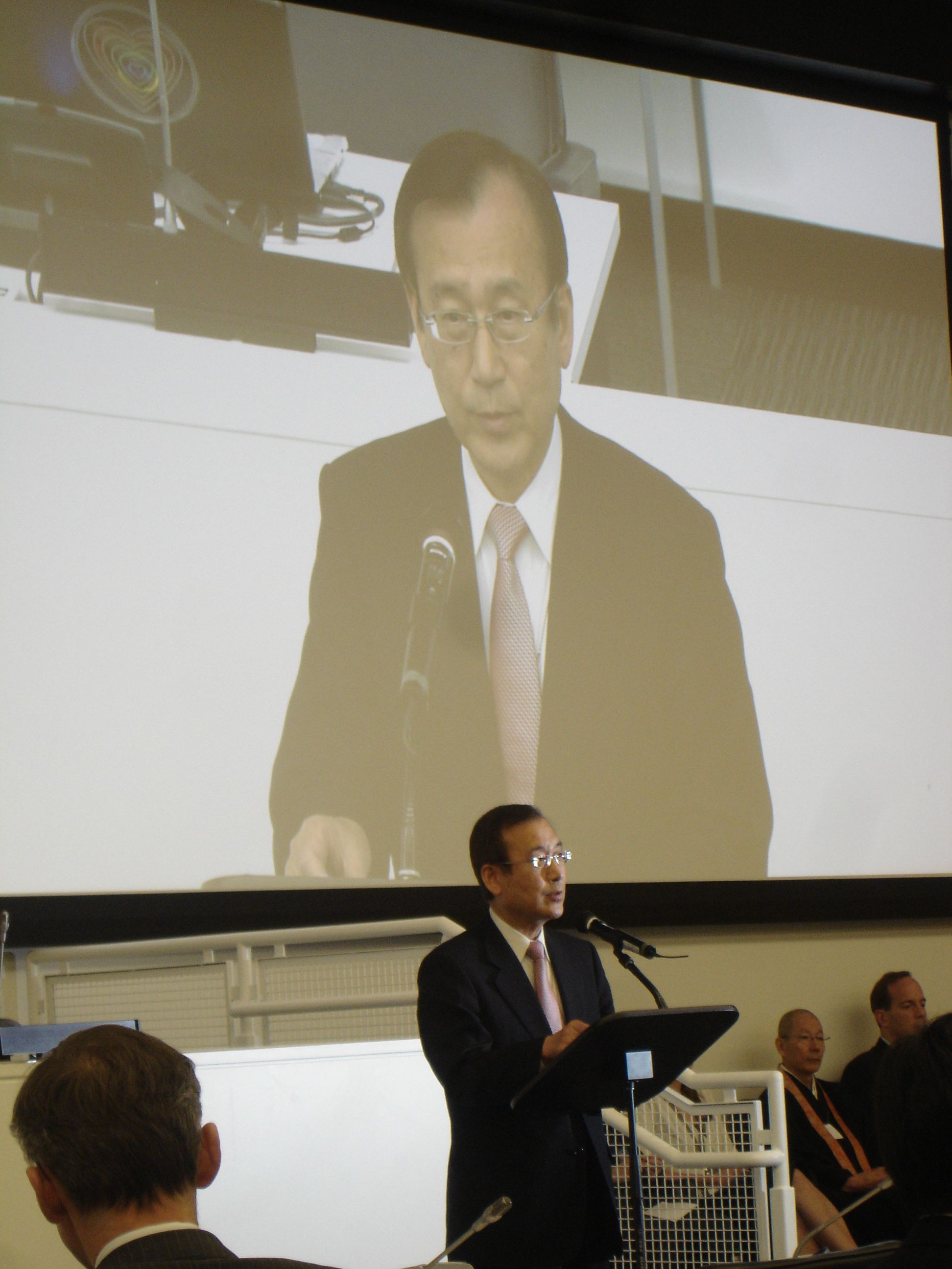 UN Photo/Mark Garten - May 5, 2010, Secretary-General Ban Ki-moon (left) speaks prior to a special screening of "Countdown to Zero", a documentary film on the history of the atomic bomb. Also at the podium are: actor and UN Peace Messenger Michael Douglas (centre) and the President of the 2010 Review Conference, Libran N. Cabactulan.